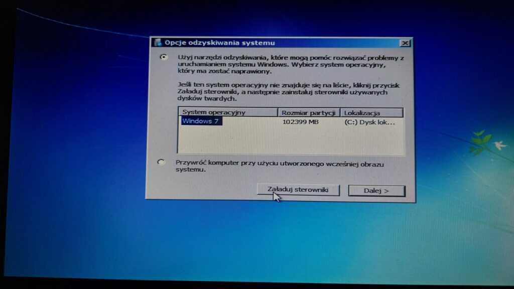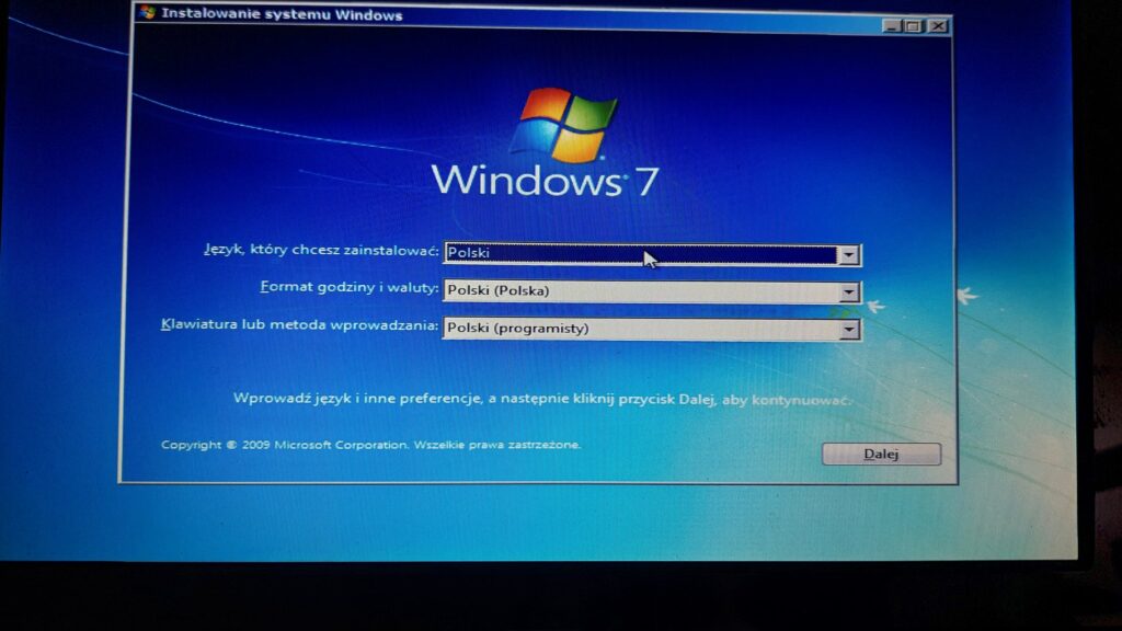 Tak przygotowany pendrive instalujemy w laptopie do naprawy (na którym usuwamy Linuxa i naprawiamy bootloader). Ponownie upewniamy się w BIOS, że laptop uruchomi się z pendrive. Nastepnie widzimy interface instalacyjny Windows7. Przechodzimy przez panel z wyborem języka: