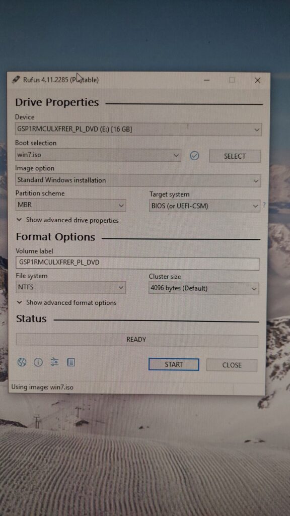Pendrive [„Wyposażenie” pkt.1 ] gdzie mieliśmy zainstalowanego Ubuntu już nie będzie nam potrzebny w tej formie i mozemy na niego nagrać Windows7 poprzez program Rufus.