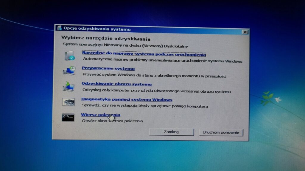 Po restarcie laptopa jak widać jest problem z uruchomieniem urządzenia:
